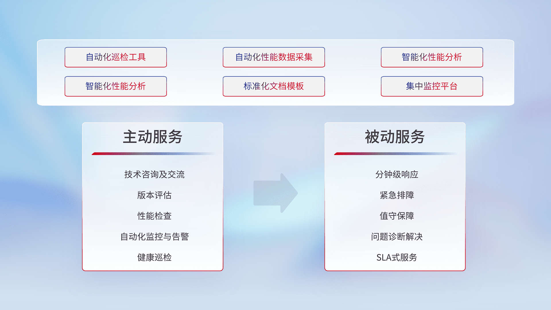 智能化工具和标准化文档,,,,保障服务质量,,,提供主动服务(包含技术咨询、、、版本评估、、性能检查、、、自动化监控与告警、、健康巡检)和被动服务包含(分钟级响应、、、紧急排障、、、、值守保障、、、问题诊断解决、、、SLA服务)。。
